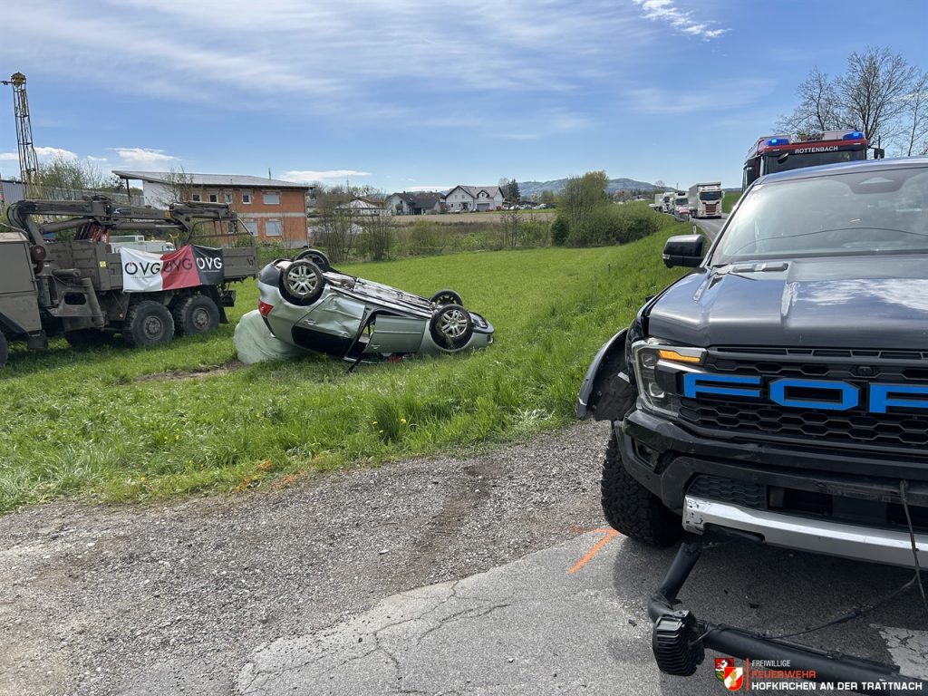„Ein 34-jähriger kroatischer Staatsbürger aus dem Bezirk Ried im Innkreis lenkte seinen PKW am 23. April 2026 gegen 14:35 Uhr auf der B141 Rieder Straße von Hofkirchen an der Trattnach kommend Richtung Rottenbach. Im Bereich Innernsee, Gemeindegebiet Rottenbach, dürfte der Mann den Bremsvorgang zweier vor ihm fahrender Fahrzeuge zu spät bemerkt haben. Um eine Kollision zu verhindern, wich der 34-Jährige nach rechts aus. Dennoch kollidierte er mit dem Wagen eines 72-Jährigen aus dem Bezirk Grieskirchen, der nach rechts abbiegen wollte. Anschließend geriet der 34-Jährige auf die Gegenfahrbahn und stieß mit dem Auto eines 34-Jährigen, ebenfalls aus dem Bezirk Ried im Innkreis, zusammen. Durch die Wucht der Kollision wurde das Fahrzeug des Kroaten von der Fahrbahn geschleudert, überschlug sich und blieb am Dach liegen. Die beiden 34-Jährigen sowie der 72-Jährige wurden unbestimmten Grades verletzt und nach der Erstversorgung in das Klinikum Wels beziehungsweise Krankenhaus Barmherzige Schwestern Ried eingeliefert.“